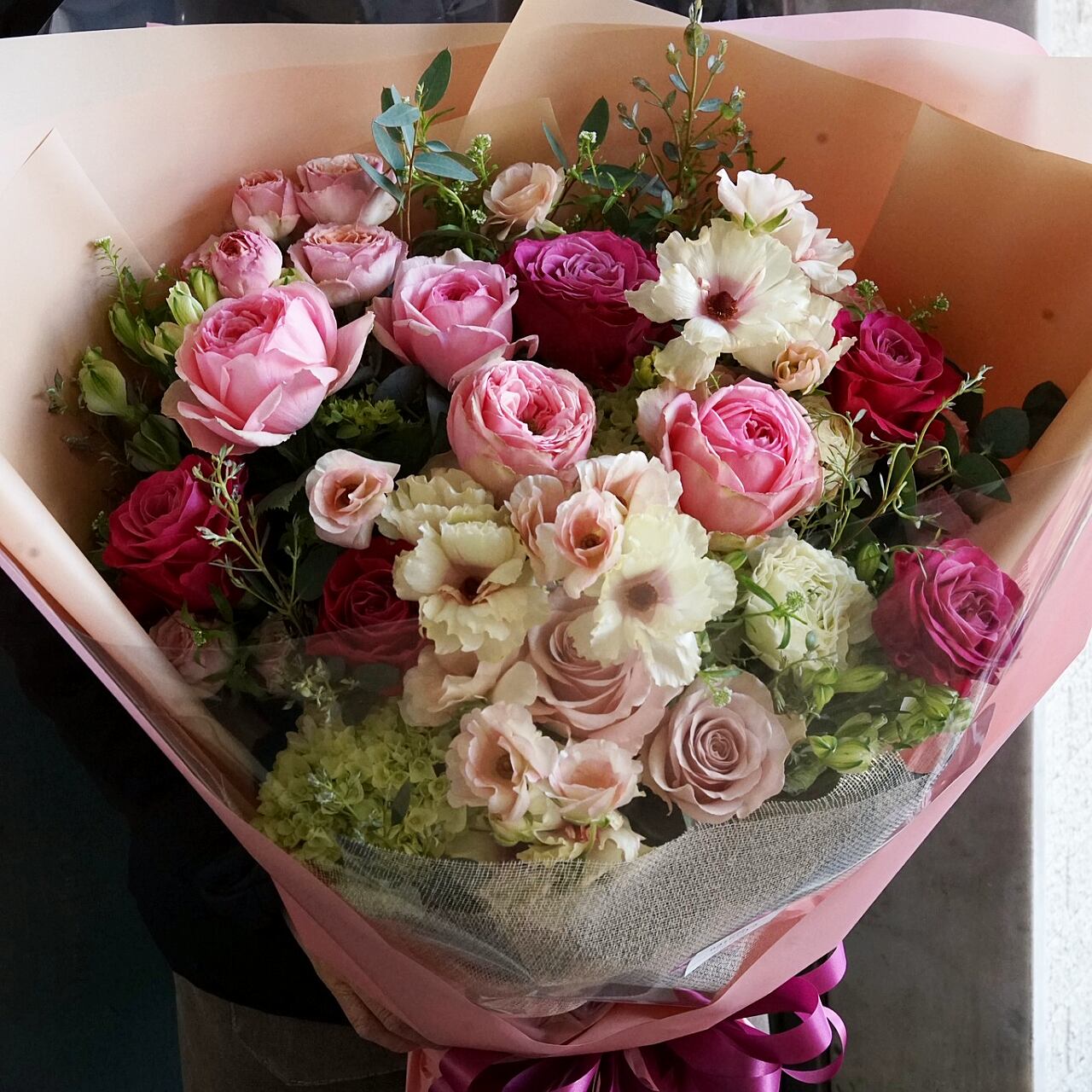 豪華なお花のプレゼントととして印象に残るボリューム感たっぷりなサイズの花束になります。