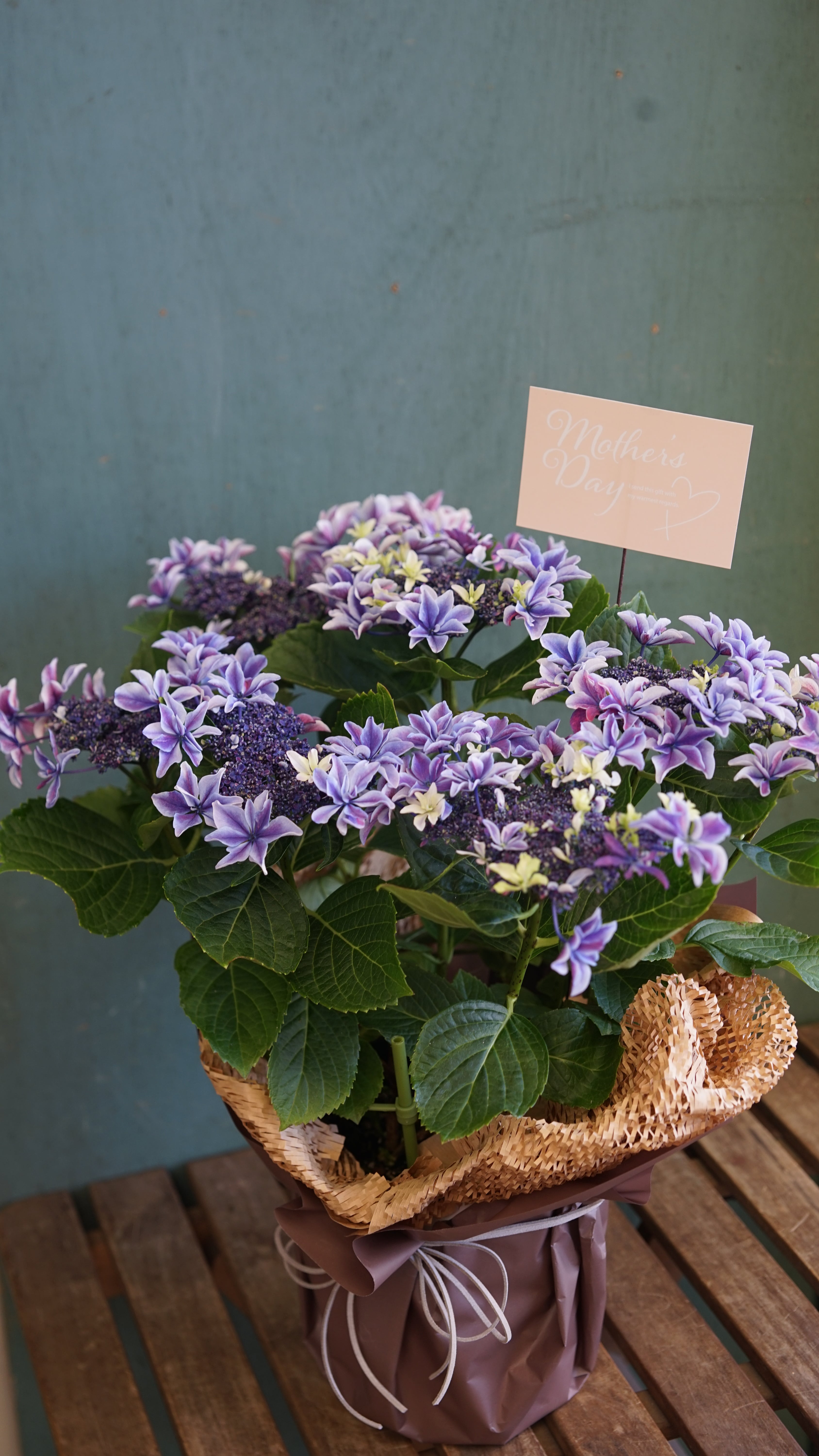九州の厳選した産地のアジサイをラッピングしてお届けいたします。